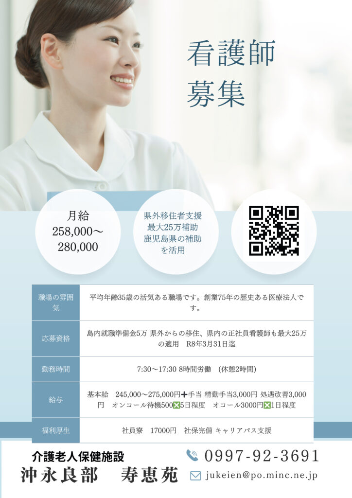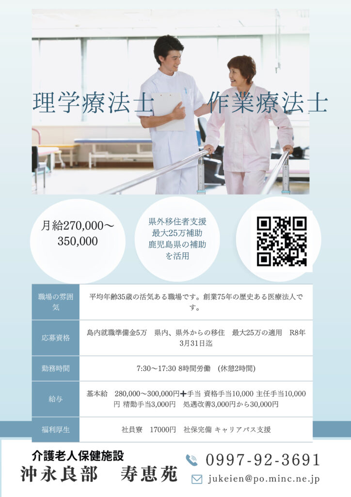目次採用情報についてお知らせいたします。 介護老人保健施設 沖永良部寿恵苑 看護師・理学療法士・作業療法士の募集情報となります。 20251201_看護師 募集ダウンロード 全ての採用情報の確認はこちらをご覧ください。 全ての採用情報はこちら ▶ お知らせ 求人